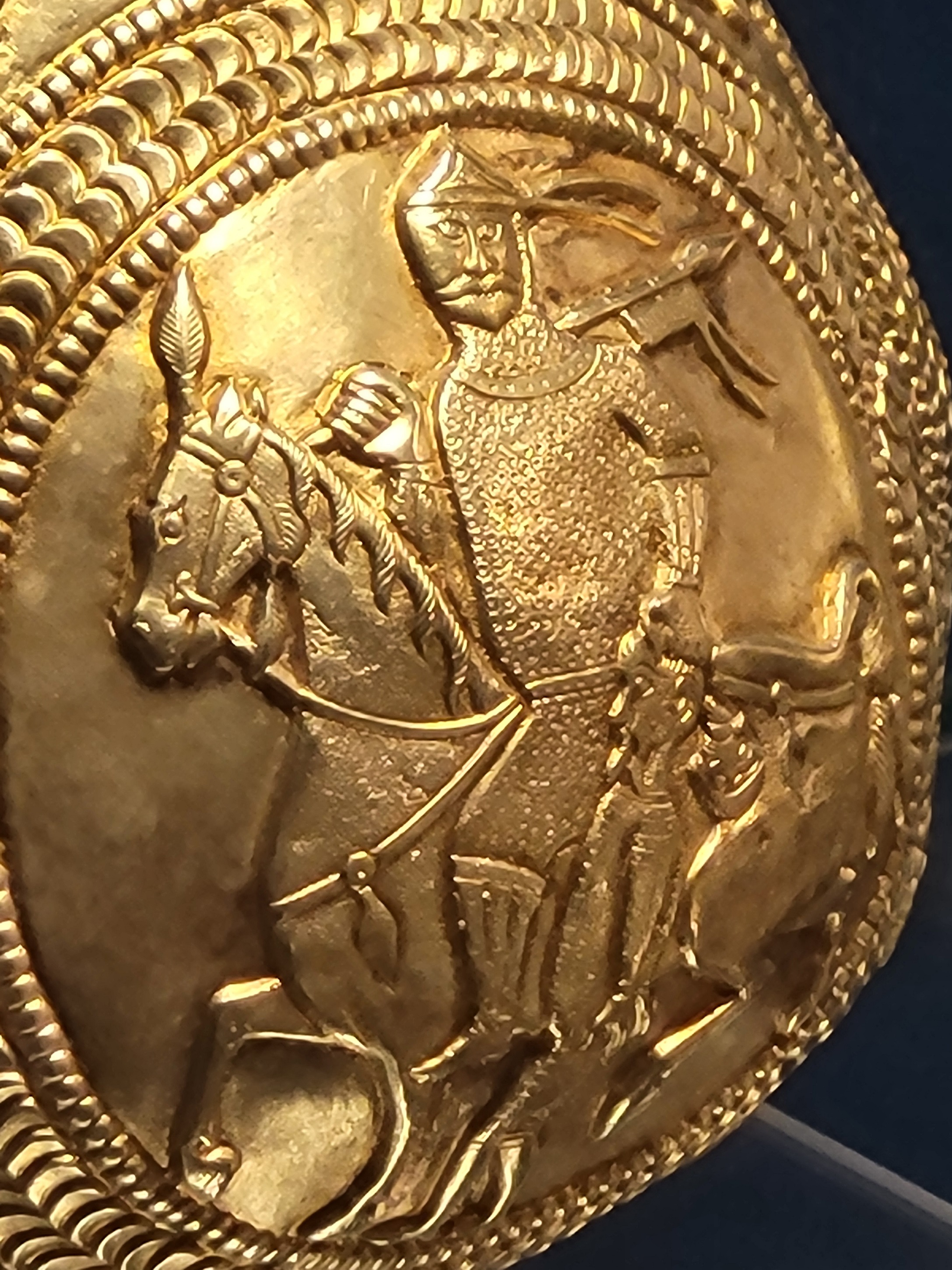 Budapest, 2026. I. 31. 15:41 CET. A nagyszentmiklósi kincsből: medalionba zárt győztes páncélos lovas ábrázolása 22 cm magas arany korsón. A bécsi Szépművészeti Múzeum gyűjteményéből. Attila: Kiállítás a Magyar Nemzeti Múzeumban 2026. január 23. és július 12. között. A victorious armored horseman - depiction enclosed in a medallion of a 22 cm high gold jug, part of the Treasure of Nagyszentmiklós, owned by the Kunsthistorisches Museum, Wien. Attila: Exhibition in the Hungarian National Museum between January 23 - July 12, 2026, evoking the king of the Huns.